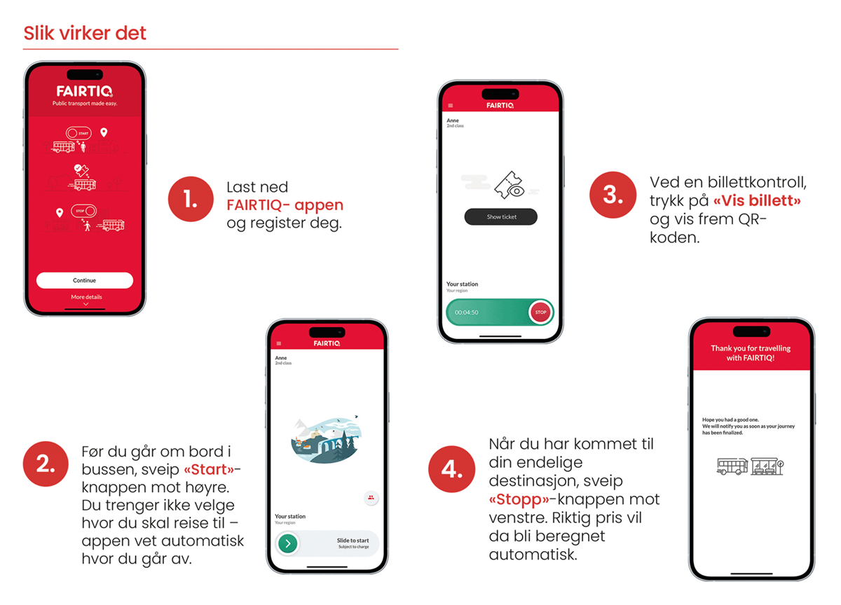 Med den nye billett-appen forsvinner behovet for å kjenne til takstsoner og billettyper på forhånd. Du bruker kun smarttelefonen din. Du laster ned Fairtiq-appen, starter den med ett sveip før du går inn i transportmiddelet og mottar en gyldig billett uten å måtte oppgi hvor du skal reise til. Ved bussbytte gjenkjenner appen automatisk endringen og fortsetter å følge reisen. Du har 30 minutter overgangstid. Når du går av bussen, sveiper du ganske enkelt for å avslutte reisen. Hvis du glemmer det, sender appen et varsel eller avslutter reisen automatisk. Den beste tilgjengelige prisen beregnes deretter automatisk. Registrer deg her.
