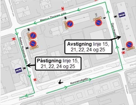 Avstigning skjer i Danvikgata, og påstigning i Rektor Nygaards gate.