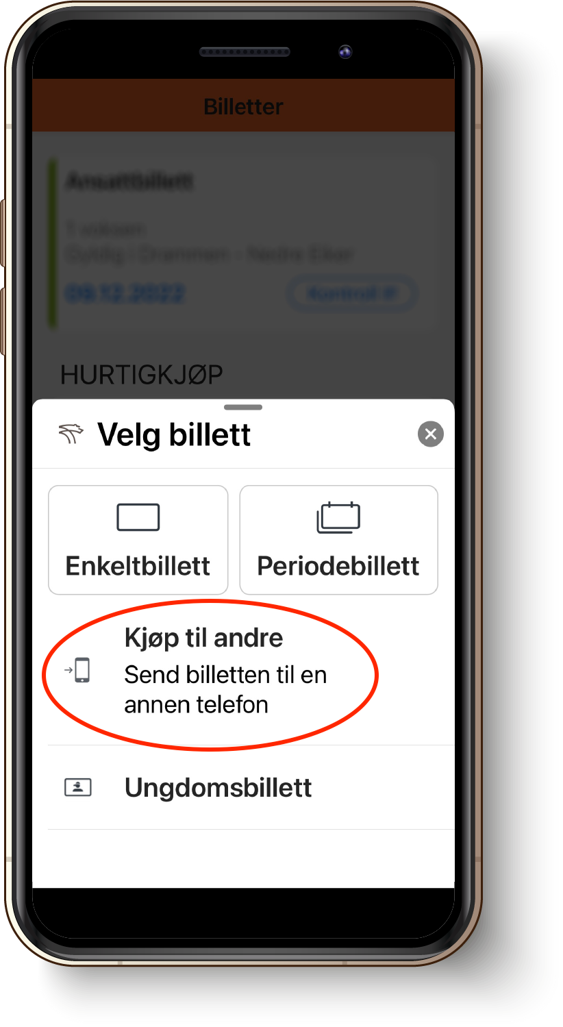 Velg "Kjøp til andre".Ved bruk av billett i mobilapp er du selv ansvarlig for å ha telefonen med deg og ha tilstrekkelig med strøm på den. Kan du ikke vise gyldig billett, må du betale ordinær pris om bord på bussen.