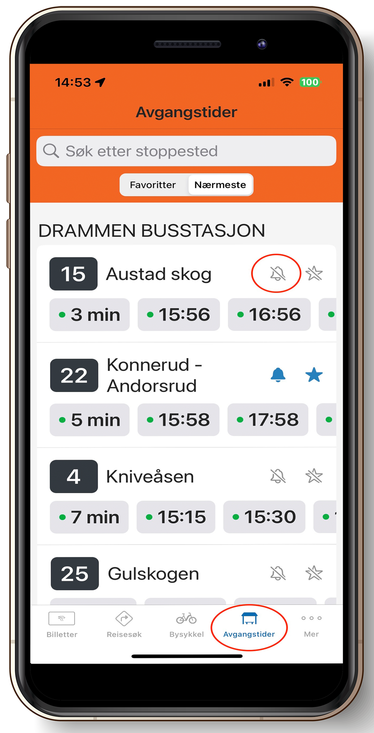 - Åpne appen og trykk på avganger/avgangstider i menyen nederst.