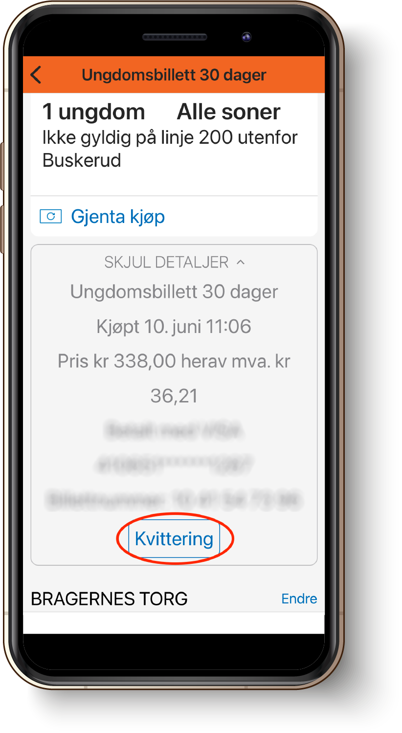 Vi anbefaler å få kvitteringen automatisk tilsendt på e-post. Kvitteringen inneholder viktig informasjon som du vil trenge hvis du mister billetten din. Det kan skje hvis du for eksempel bytter/mister mobil, sletter appen eller tilbakestiller til fabrikkinnstillinger.