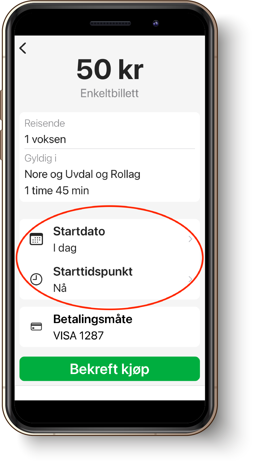 Enkeltbilletten, 24-timersbilletten, 7-, 30-, og 365-dagersbilletten kan kjøpes inntil syv dager frem i tid. Du velger når billetten skal aktiveres i vinduet «Bekreft kjøp». Billetten aktiveres automatisk på tidspunktet du har valgt. Du kan endre starttidspunktet inntil tre ganger. Billetter som ikke er startet kan du kansellere i appen.