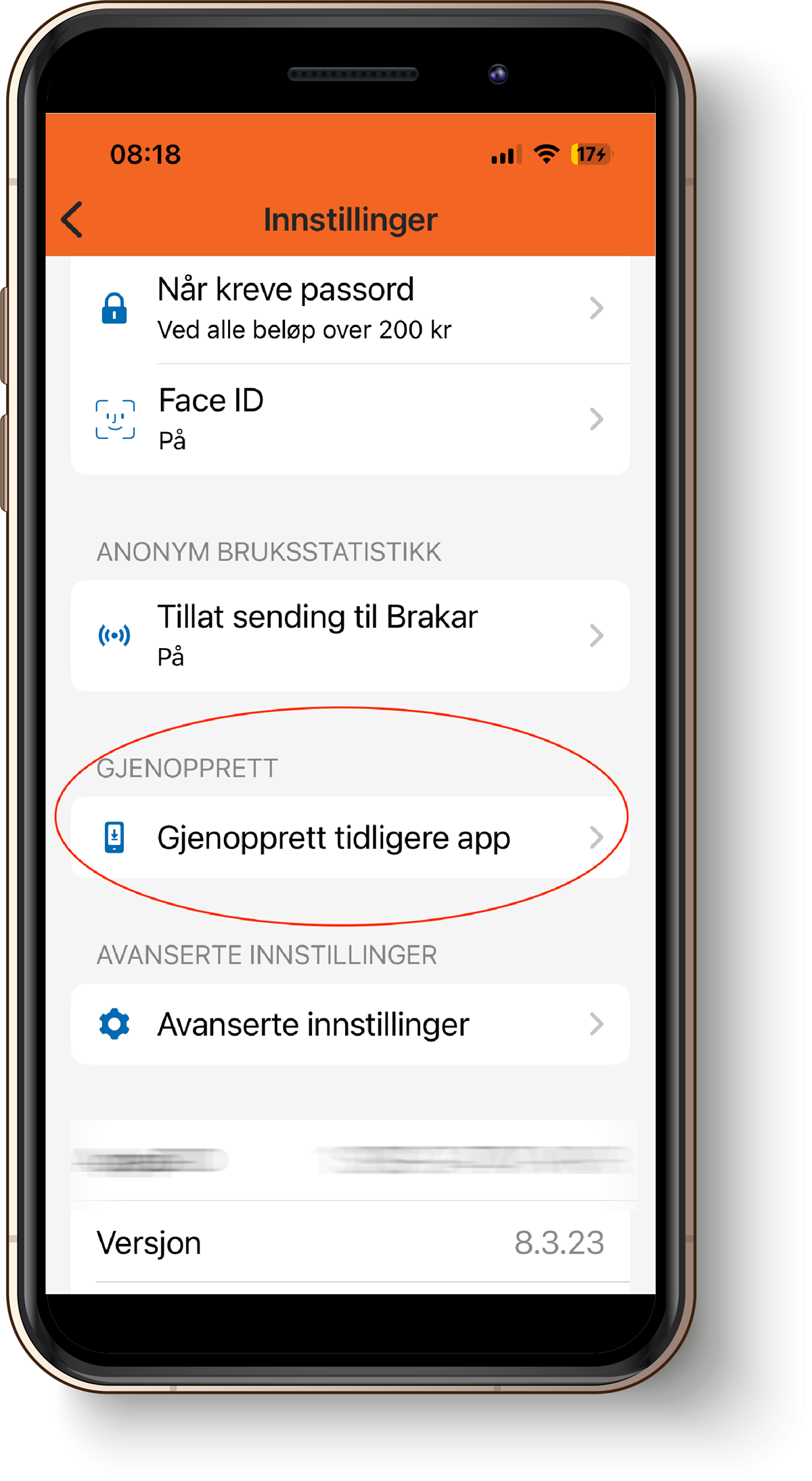 Dersom du har Brakar app-ID fra gammel telefon, eller du har registrert telefonnummeret ditt i appen, så vil du selv kunne gjenopprette billetten din. Da går du inn på innstillinger, og så "Gjenopprett tidligere app", og så velger du enten fra app-ID eller fra telefonnummer: