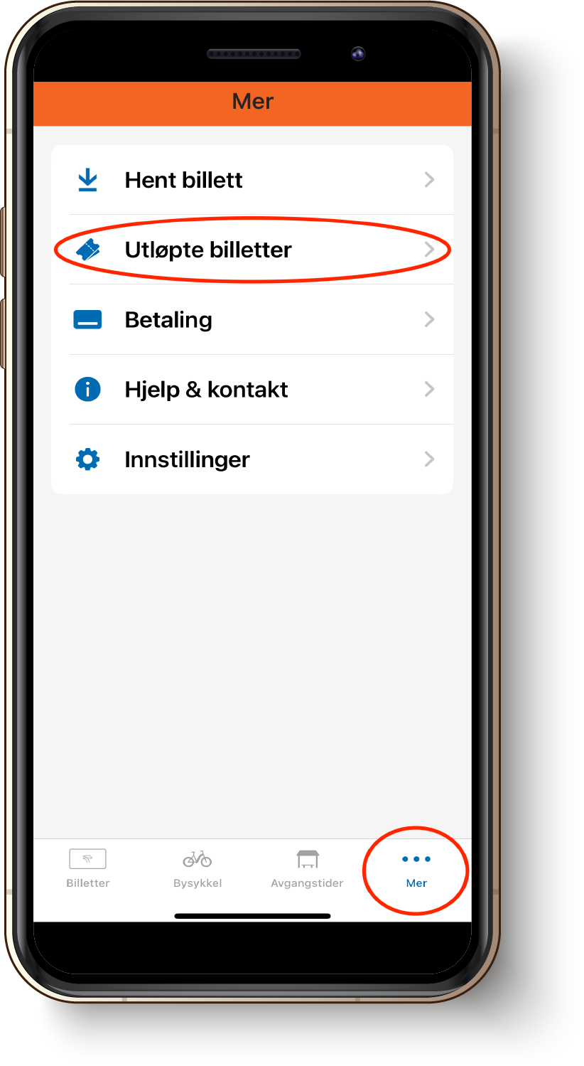 Du kan også hente kvittering for utløpte billetter manuelt etter kjøpet. På Android så går du til «utløpt/hentet billett», på iPhone velger du "Mer" i menyen og så "utløpte billetter". Trykk så på billetten du ønsker kvittering for, og så velger du "Kvittering" under billetten. Skriv inn e-postadressen, så får du kvitteringen tilsendt.