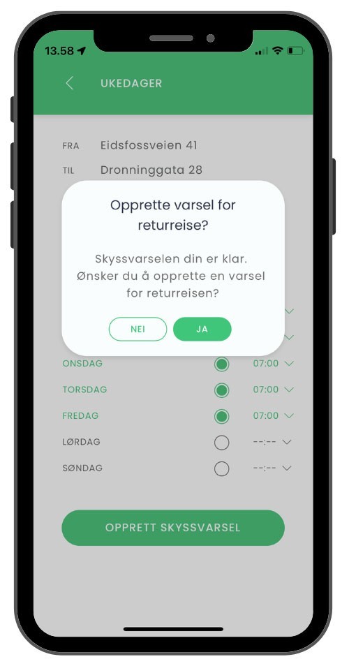 Hvis du vil sitte på med noen hjem fra jobb, kan du søke opp en reise i appen og se om noen tilbyr skyss. Dersom skyss er tilgjengelig vil du da kunne be om å få sitte på. Sjåføren får da et varsel i appen, og så fort forespørselen din er godkjent, får du en bekreftelse på turen. Inne i appen er det en meldingsfunksjon, slik at sjåfør og passasjer kan kommunisere med hverandre ved behov.